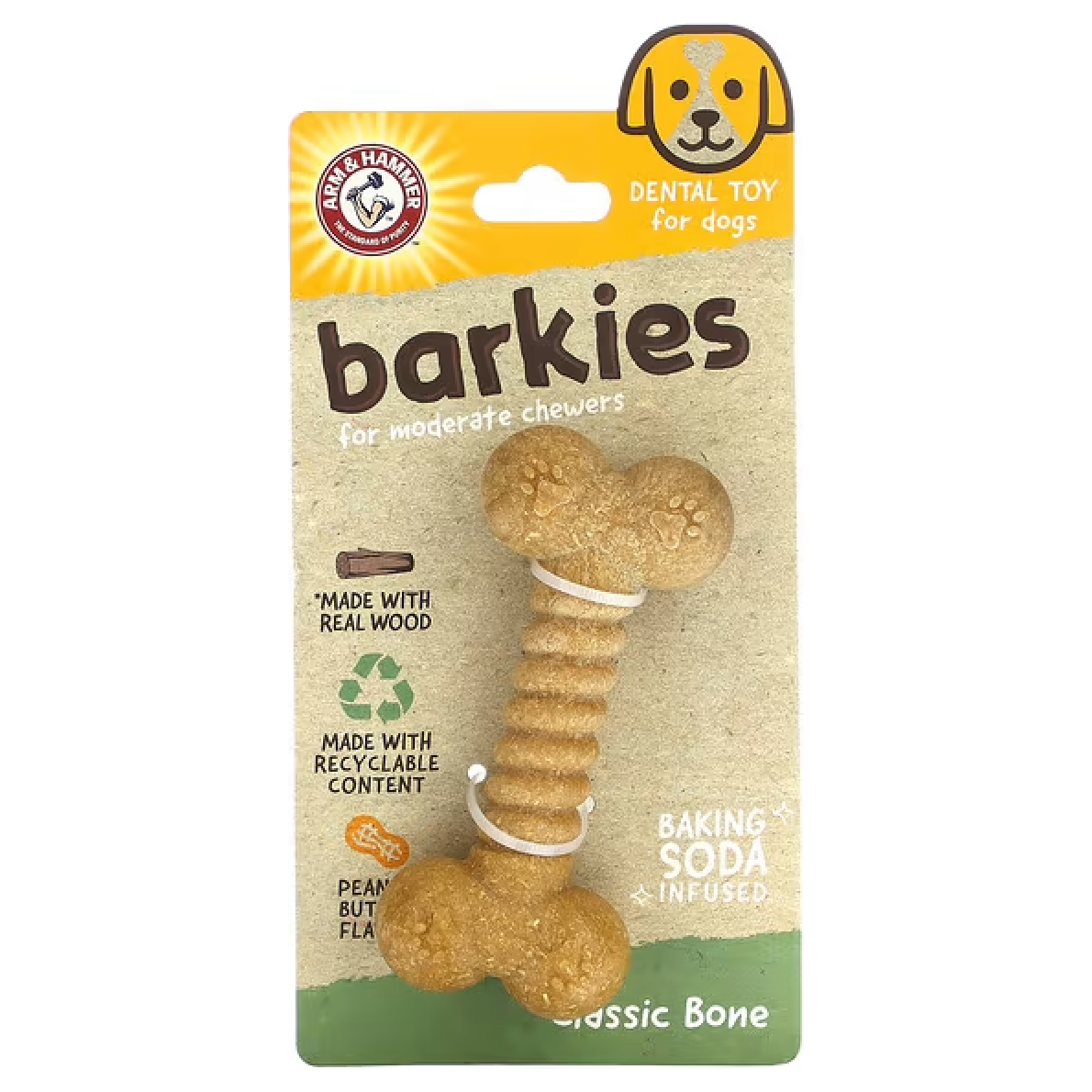 Redirect destructive chewing into positive playtime with Barkies that act as both a fun toy and a healthy dental chew