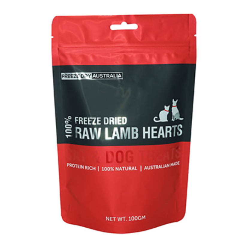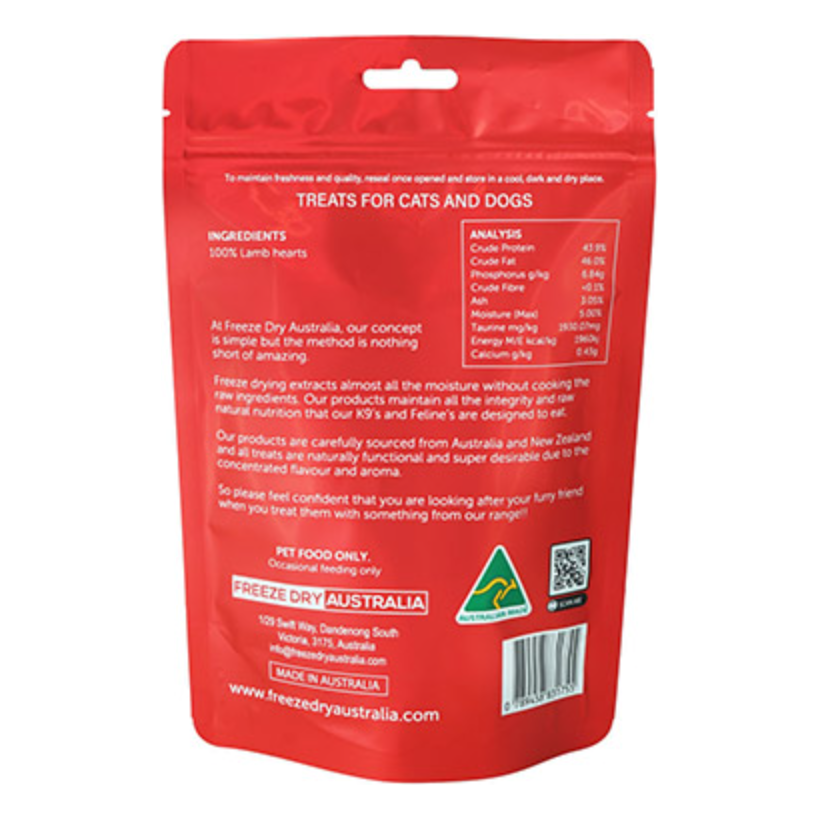 Freeze Dry Australia’s Lamb Hearts are made from 100% Lamb Heart. Lamb Hearts are a protein-rich, nutrient powerhouse, packed with essential vitamins and minerals such as Thiamine, Vitamin B6, Phosphorus and Copper, and a very good source of Protein, Riboflavin, Niacin, Vitamin B12, Pantothenic Acid, Iron and Selenium. This makes them an excellent choice for supporting your pet’s overall health and vitality. Whether used as a training reward, a snack, or a meal supplement, these freeze-dried Lamb Hearts offer a satisfying texture that pets adore.