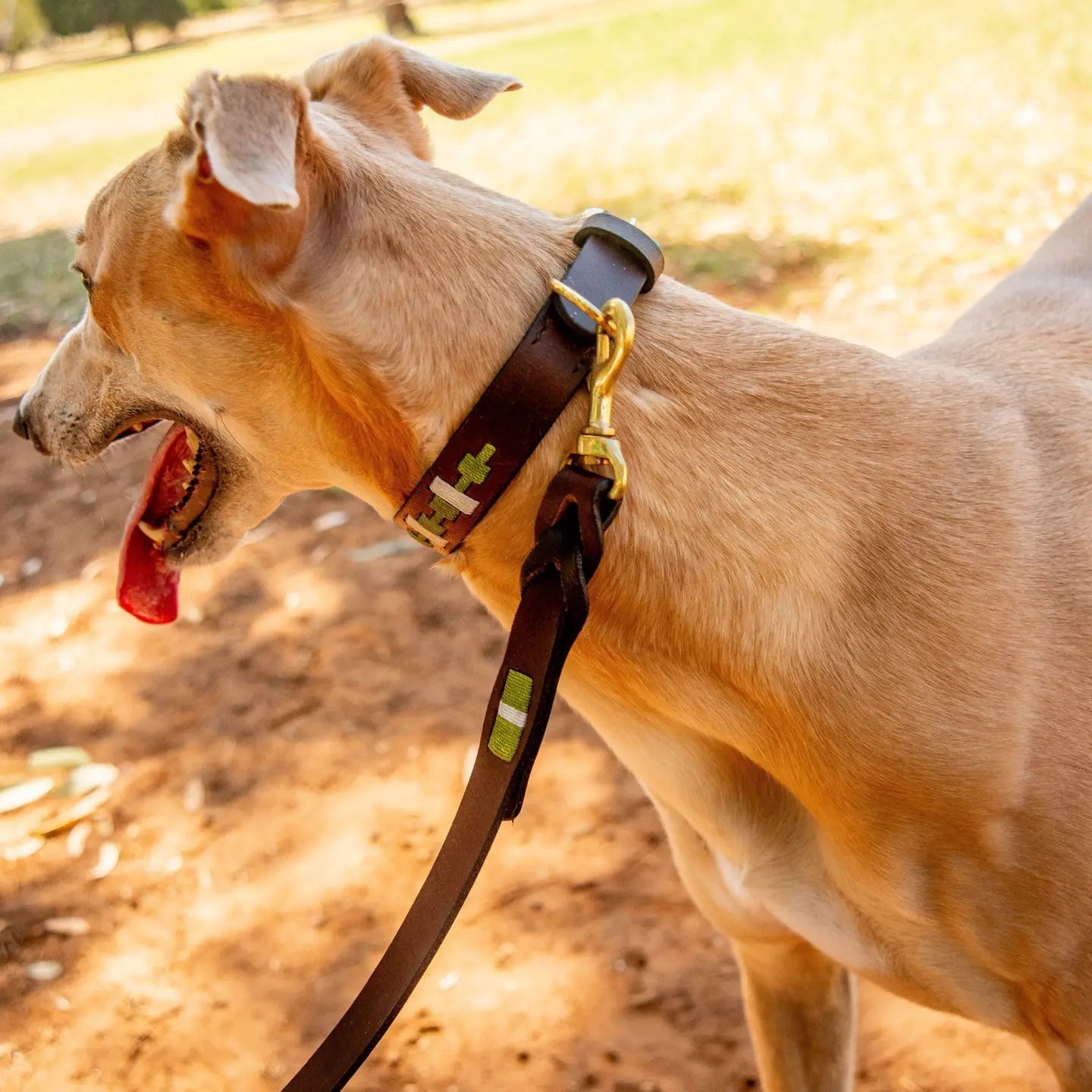 A lighter-weight lead in durable deep brown buffalo harness leather, green and white waxed threads handstitched and antique brass hardware.