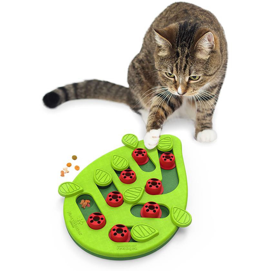 The Petstages Nina Ottosson Buggin’ Out Puzzle & Play is an interactive treat-hiding game for cats with 8 treat compartments that are hidden by swiveling leaves or sliding ladybug blocks.