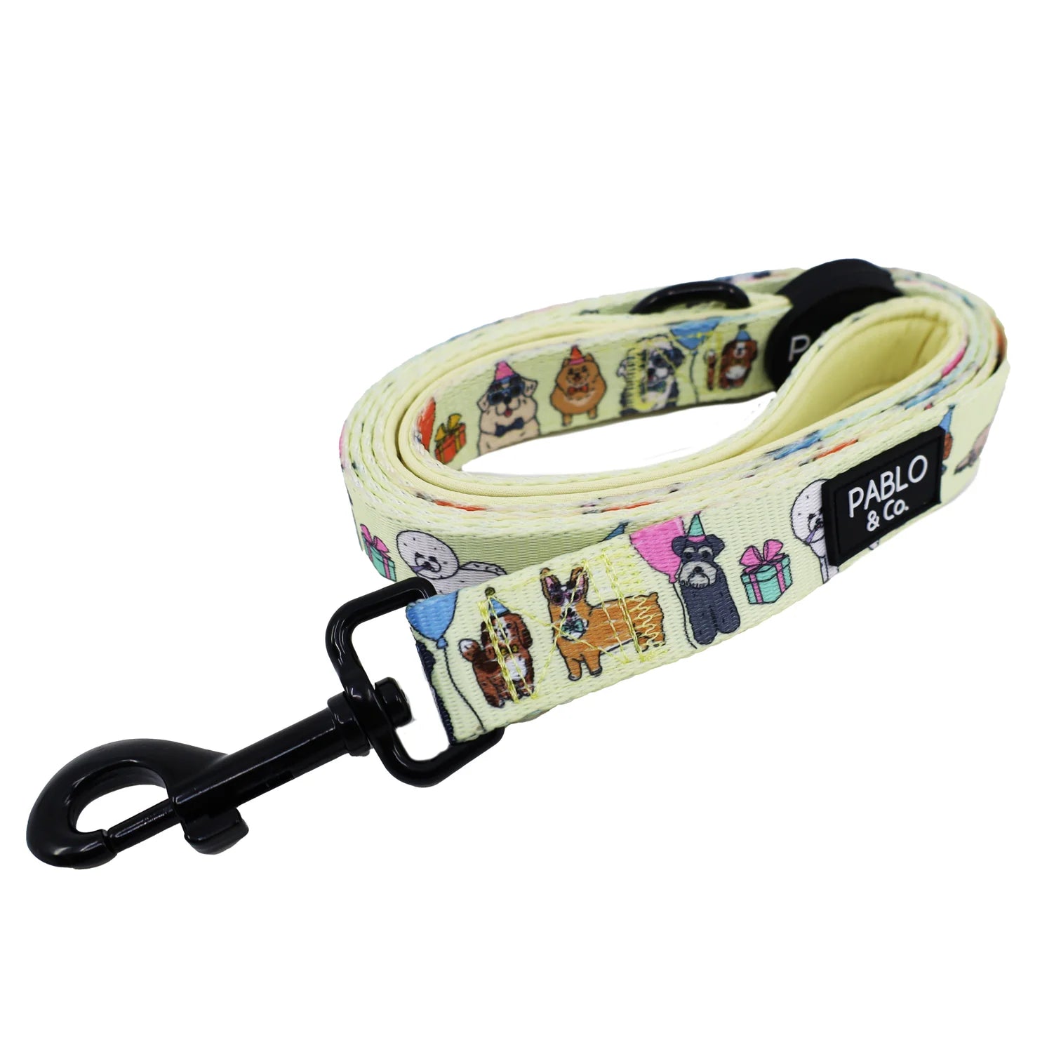 Our leashes feature a neoprene padded handle for a soft grip, polyester strap webbing and a black heavy duty spring clip leash end.