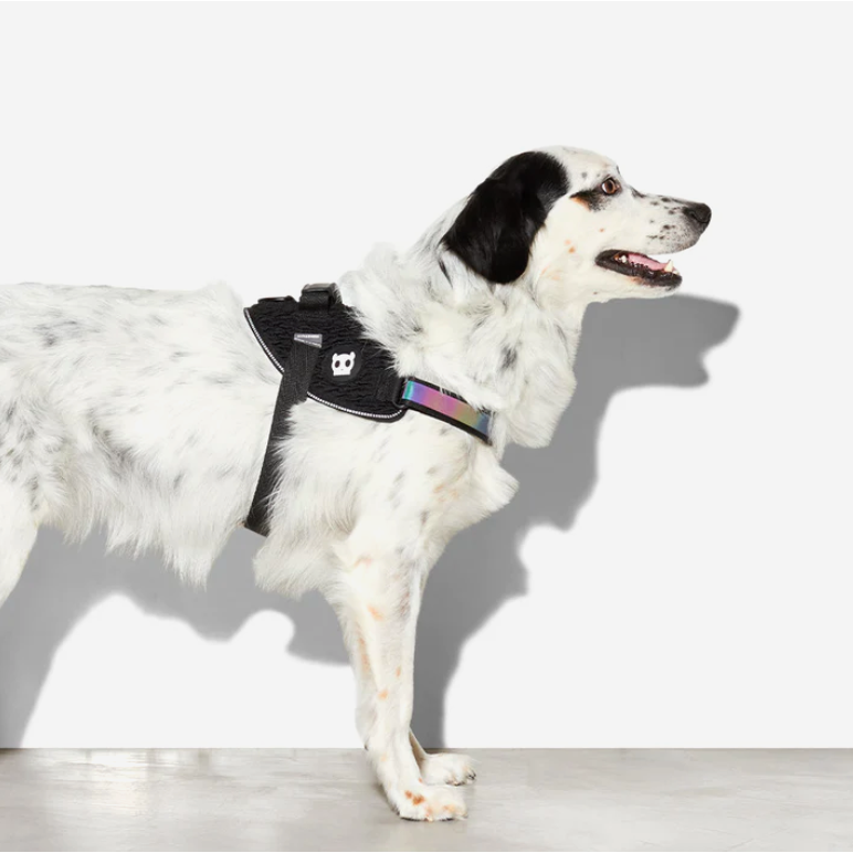 • Rainbow reflective strap along the neck is visible on the front and sides
